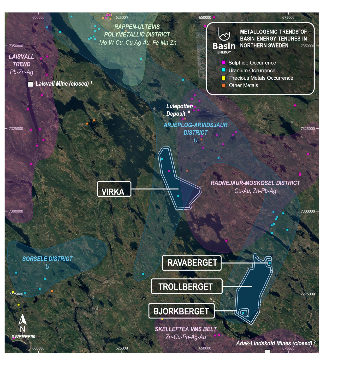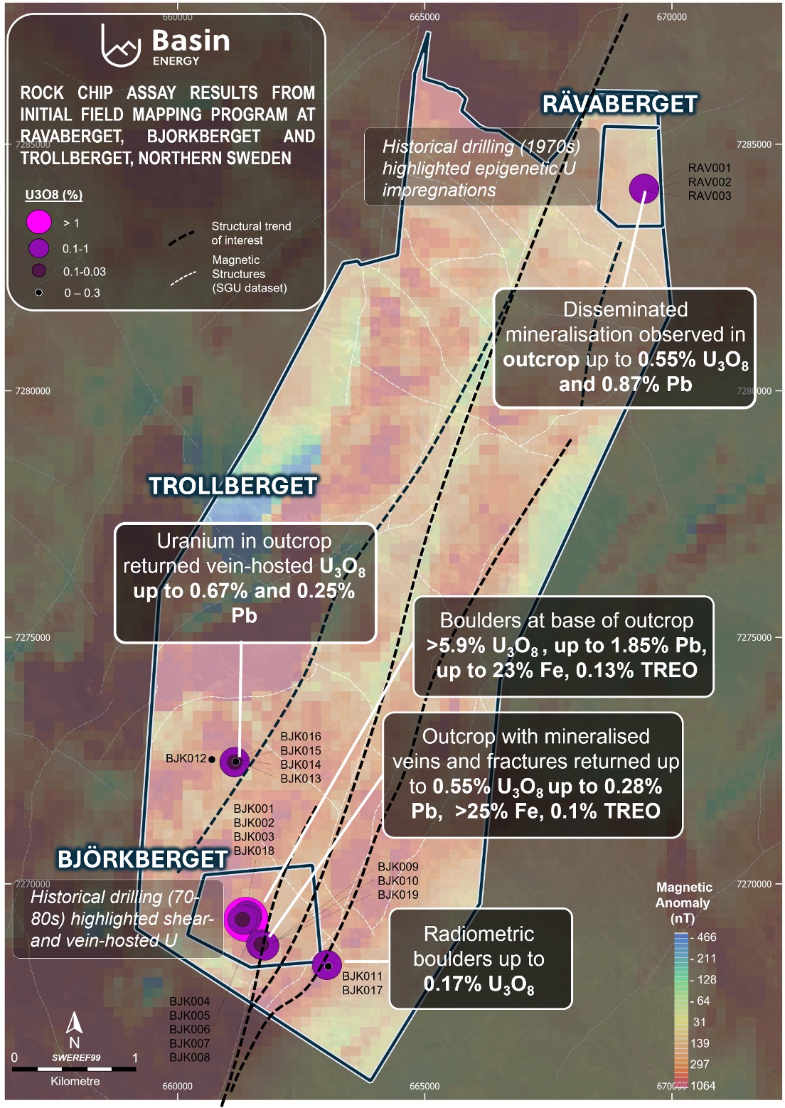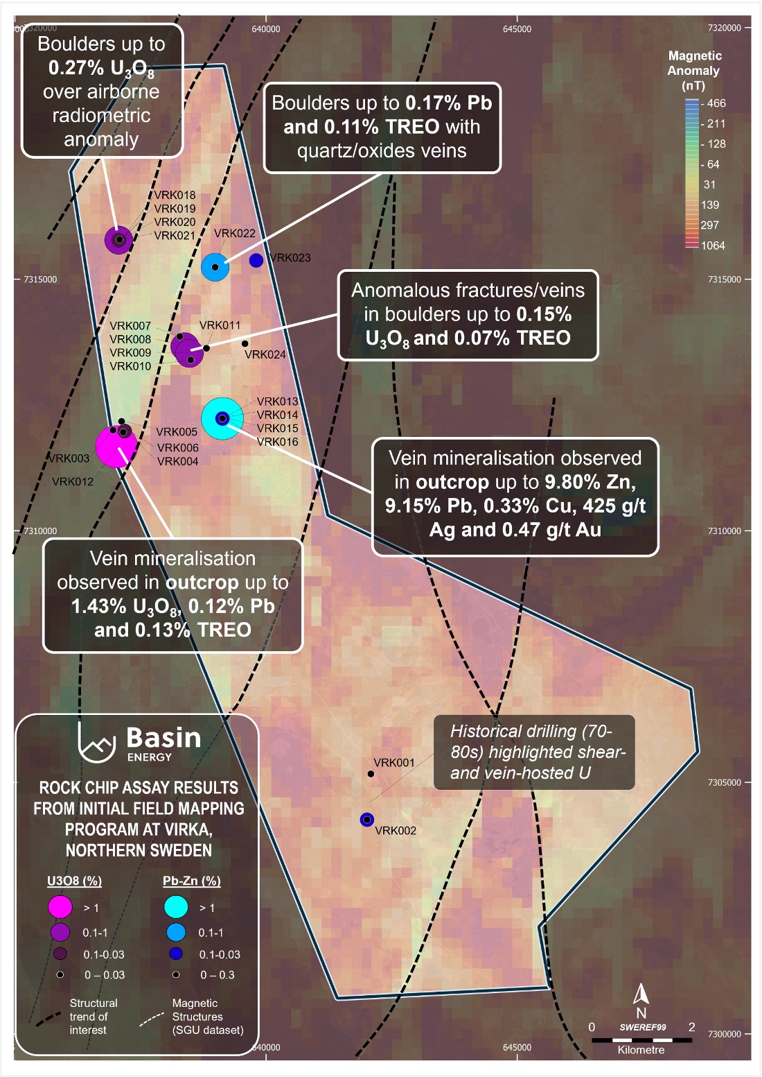 Since acquisition in Q4 2024, Basin Energy conducted an initial reconnaissance mapping and sampling program (45 rock chip samples collected and analysed) and has completed structural logging and sampling of 59 priority historical drill holes from the Virka, Björkberget and Rävaberget projects.