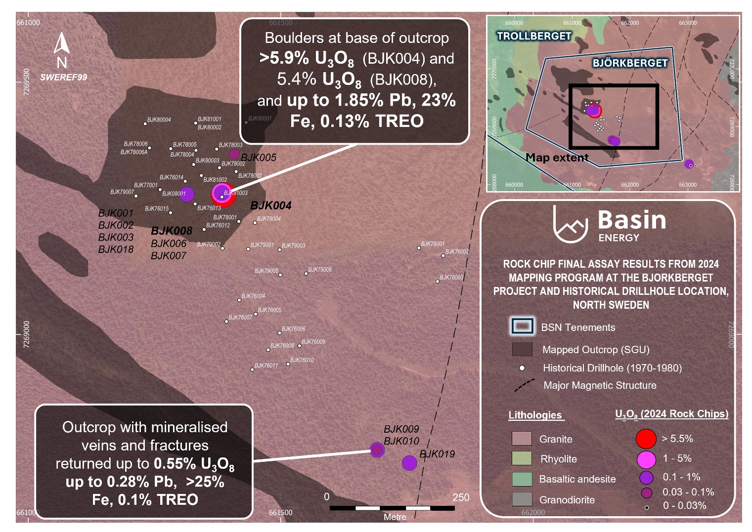 - BJK004: Exceeded detection limits again returning >5.9% U3O8 and Pb 1.39%, Fe 23.4%, 0.13% TREO (74% HREO) from granite boulder sample with visible yellow oxide staining located at the base of an outcrop.