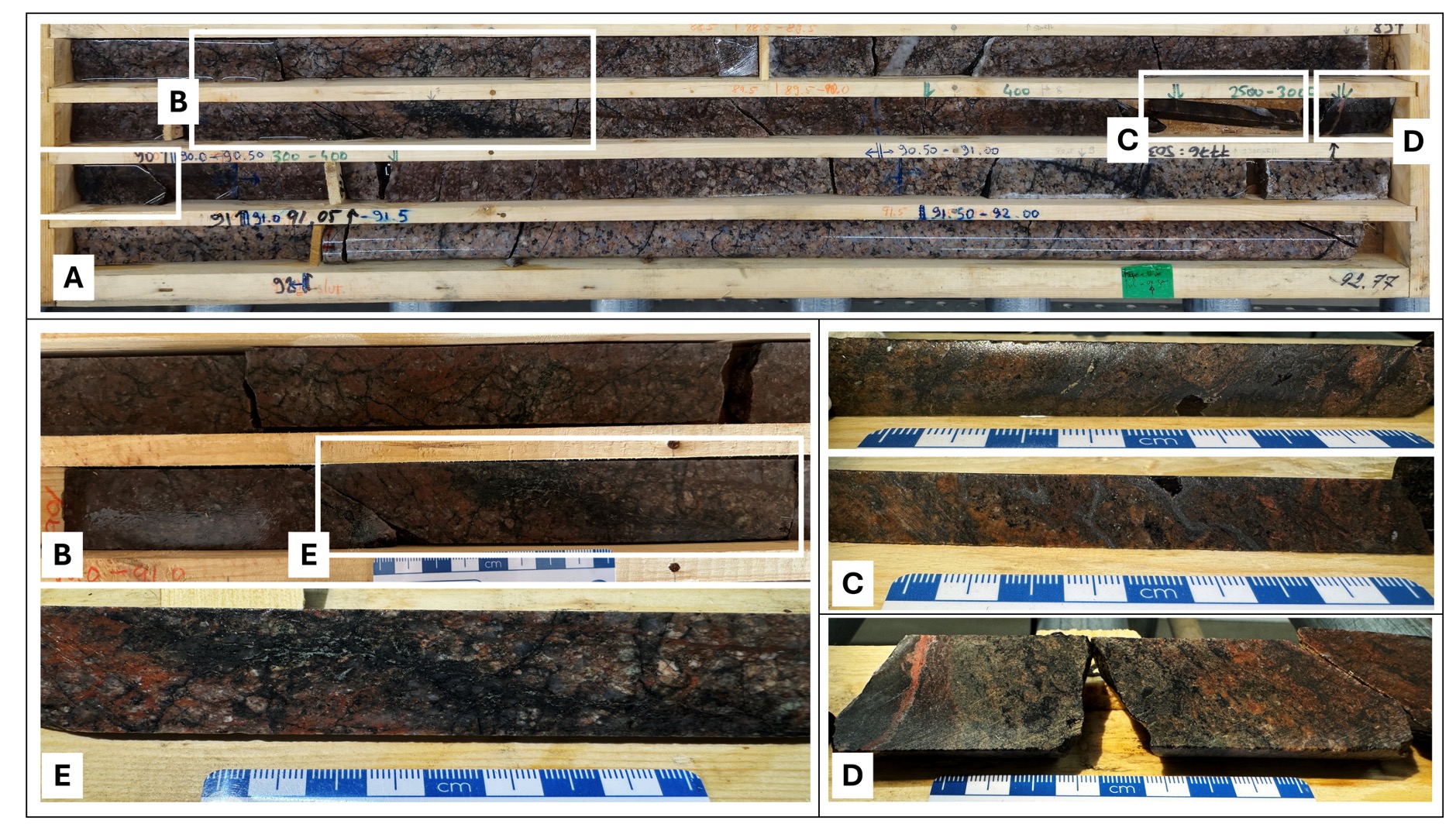 A. Photograph of core interval between 89.0-92.8 m showing half core remaining where it has been historically sampled, with only quarter core remaining for the most radiometric anomalous interval “C” (limiting ability resample using chemical assay). B. Close up photograph of magnetite/hematite vein stockwork. C. 10 cm interval displaying uraninite nodules in magnetite/hematite veins. D. Mineral zonation in footwall of mineralised interval. E. Close up photograph of magnetite/hematite vein stockwork.