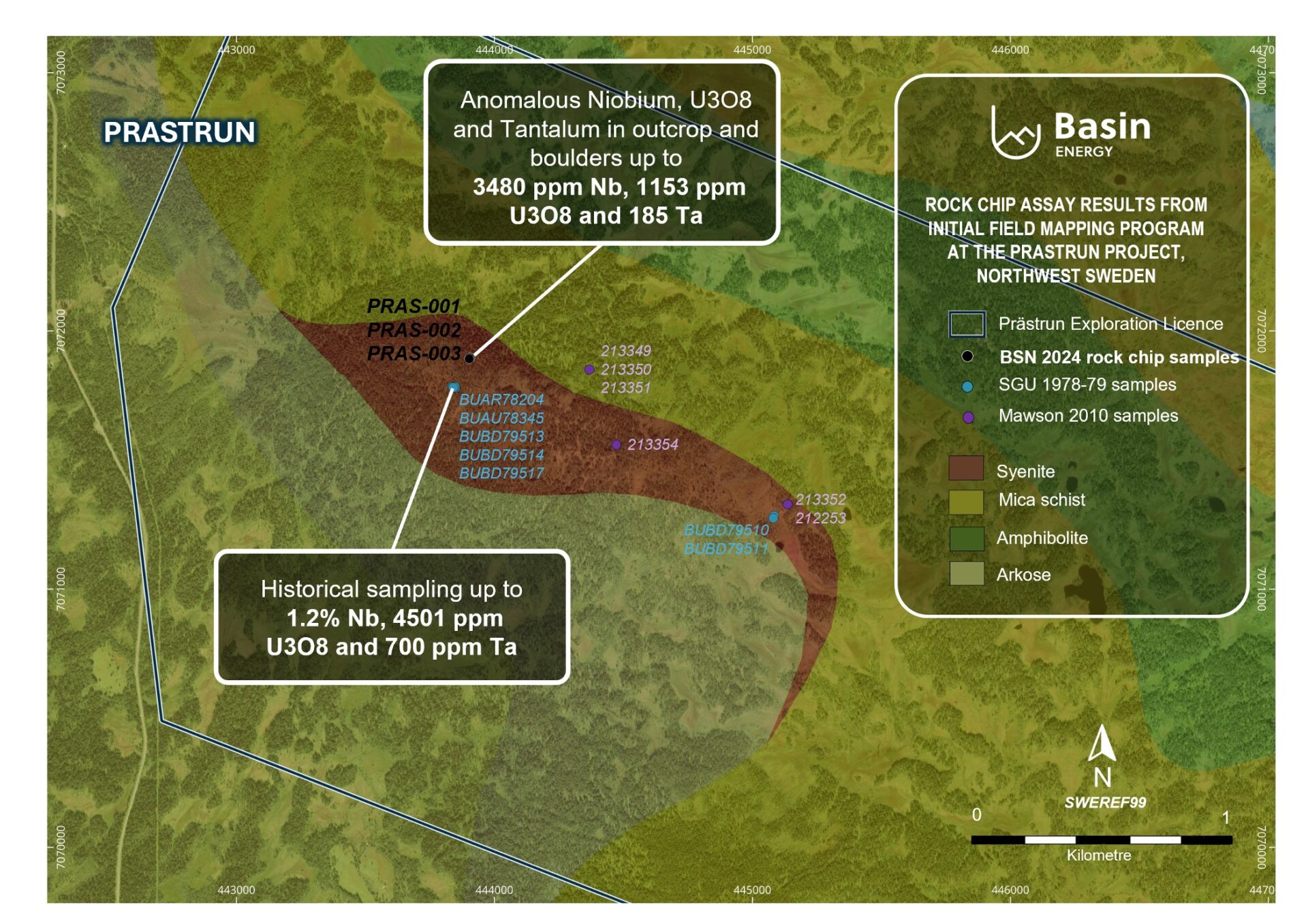 Basin conducted a short two-day field visit in Q4 2024 to attempt locating additional syenite gneiss outcrops. Three rock chip samples were collected from a syenite outcrop 130 m north of historical sample site (Figure 5) with assay results returning anomalous niobium, uranium and tantalum: